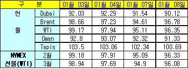 1월8일 1.45달러 하락 90.12달러 형성 … WTIㆍBrent는 급등 1월8일 Dubai유 현물가격이 90달러대 초반으로 큰 폭으로 하락했다.또 국제유가는 미국 원유 재고가 감소할 것이라는 예상과 나이지릴아 무장세력의 석유시설 공격 가능성이 제기되면서 상승했다. 한국석유공사에 따르면, WTI(서부텍사스 중질유) 선물유가는 전일대비 1.24달러 상승한 96.33달러에, 런던석유거래소(ICE)의 Brent 선물유가는 1.15달러 상승한 95.54달러에 거래를 마감했다. Dubai유 현물가격은 전일대비 1.42달러 하락해 90.12달러를 형성했다.