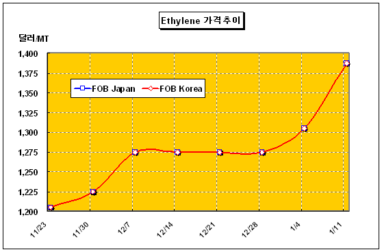 FOB Korea 1385-1390달러 형성 … 일본 이어 타이완 120만톤 트러블 에틸렌 가격은 1월 둘째 주 FOB Korea 톤당 1385-1390달러로 83달러 상승했다.아시아 에틸렌(Ethylene) 시장은 일본 Mitsubishi에 이어 타이완 Formosa의 크래커 트러블이 발생하면서 83달러 폭등해 1400달러에 육박했다. Formosa Petrochemical의 Mailiao 소재 나프타(Naphtha) 베이스 No.3 에틸렌 120만톤 크래커가 1월10일 트러블로 가동을 중단해 공급 차질을 빚고 있기 때문이다. Formosa는 2주 동안 누출문제를 바로 잡은 후 재가동할 예정이고 에틸렌 재고도 충분해 Spot 구매에 나서지 않겠다고 밝혔으나 동북아 시장에 주는 충격이 컸다.