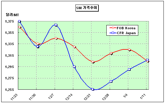 FOB Korea 1304-1305달러로 20달러 하락 … 중국 재고량 넘쳐 SM(Styrene Monomer) 가격은 1월 첫째 주 FOB Korea 톤당 1305달러로 하락했다.중국의 PS(Polystyrene) 수요가 저조해 SM 재고가 높은 수준을 나타내고 있기 때문으로 SM 가격 1300달러 붕괴 가능성이 현실화되고 있다. 이에 따라 J&J는 2월 초순 및 3월 공급가격을 FOB Korea 톤당 1315달러, 1335달러로 인하했다. 중국의 SM 시장은 PS 및 EPS(Expandable PS) 침체로 SM 재고가 2007년 12월 말 기준 8만2000톤 수준에 달하는 등 수요가 살아나지 않고 있다. 중국 내수가격은 전주대비 ex-tank Jiangyin/Zhangjiagang 톤당 25위안 떨어지면서 1만1225위안으로 약세를 지속하고 있다.
