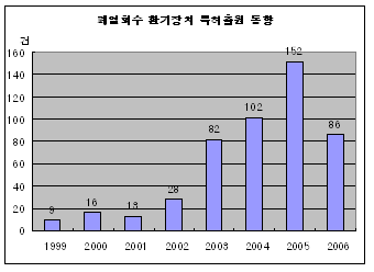 한국 특허출원은 LG전자가 43%로 가장 많았으며, 대우일렉트로닉스와 삼성전자가 각각 11% 및 10%를 차지하고 있고 나머지는 다수의 외국기업, 중소기업 및 개인이 출원하고 있다. 한편, 일본은 1990년경 이미 새집증후군이 대두돼 1990년대 연평균 32-52건이 특허출원됐고, 2000년 이후에는 3-30건으로 점차 감소되고 있다. 환기설비로 실내공기질의 개선효과를 거두었고 시장이 포화되었기 때문으로 판단된다. 특허청 관계자는 “아파트에서의 건강 및 에너지 절약에 관한 관심으로 폐열회수 환기장치의 중요성은 더해질 것”이라며, “출원이 앞으로도 지속적으로 증가할 것”이라고 전망했다. <김 은 기자> 표, 그래프: | 폐열회수 환기장치 특허출원 동향 | <화학저널 2008/1/16> |
