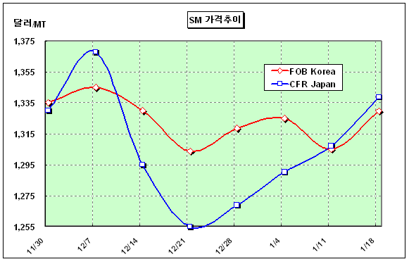 한편, 미국의 SM 가격은 FOB US Gulf 파운드당 58.3-58.8센트로 톤당 평균 1290달러를 나타내 보합세를 형성했다. 표, 그래프: | SM가격추이 | <화학저널 2008/1/23> |