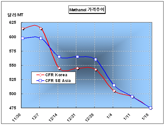 1월 APCP 720달러에 Spot 470-480달러 … Methanex 횡포가 문제 메탄올(Methanol) 가격이 2008년 들어서도 하락세를 지속하고 있다.아시아 메탄올 가격은 1월18일 CFR Korea 톤당 470-480달러로 20달러 하락했다. 중국가격이 약세를 보이고 있기 때문으로, 중국 내수가격은 ex-tank 톤당 3250-3300위안으로 수입가격 기준 350달러에 불과한 상태이다. 따라서 Methanex와 계약구매하고 있는 메탄올 무역상 및 수요처들은 상당한 타격을 입을 것으로 예상되고 있다. Methanex는 1월 APCP9Asia Posted Contract Price)를 CFR Asia 톤당 720달러로 고시해 Spot 가격과의 차이가 240-250달러에 달하고 있다.