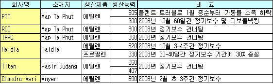 상반기 크래커 정기보수 없이 풀가동 … 10월 일부 크래커 가동중단 2008년 상반기 동남아시아의 올레핀 생산량이 증가할 전망이다.ROC, IRPC 등 석유화학기업들이 2008년 에틸렌(Ethylene) 크래커 정기보수를 건너뛸 것으로 알려진 가운데 정기보수를 계획하고 있는 곳도 하반기에나 가동을 중단할 예정이어서 상반기 생산량 확대가 예상된다. ROC는 Map Ta Phut 소재 에틸렌 80만톤 크래커의 정기보수를 2008년 이후로 계획하고 있으며, IRPC도 2008년에는 에틸렌 36만톤 크래커의 정기보수를 계획하지 않고 있다. 말레이의 Titan도 Pasir Gudang 소재 에틸렌 26만톤 및 40만7000톤 크래커 모두 2008년에는 정기보수를 실시하지 않을 것으로 나타났다.