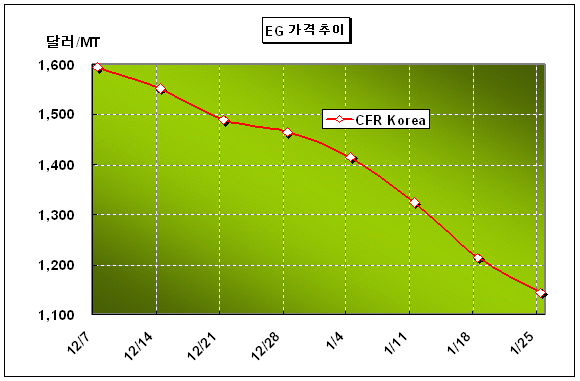 타이완의 Nanya가 5일간 가동을 중단했던 Mailiao 소재 MEG 플랜트를 1월23일 재가동한 것으로 나타나 공급까지 증가하고 있기 때문이다. 표, 그래프: | MEG가격추이 | <화학저널 2008/1/29> |
