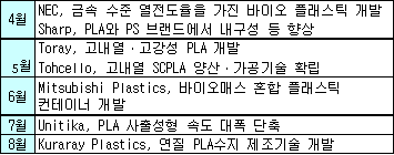 2007년, 일본의 PLA 생산기업들은 다양한 신기술 개발로 용도를 개척함으로써 사업화의 기반을 강화해 2008년에는 본격적인 생산ㆍ보급에 나설 것으로 전망된다.