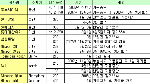 SMI 34만톤 4월-5월 가동중단 … 정기보수와 맞물려 상쇄효과 SM(Styrene Monomer) 시장은 2007년 말부터 가동중단이 속출한 가운데 2008년 들어 정기보수가 봇물을 이루어 수급타이트가 전개되고 있지만 당초 예정됐던 SMI의 가동중단이 연기되면서 타이트가 완화될 것으로 전망된다.SMI의 Merak 소재 24만톤이 2007년 11월8일 누출사고로 가동을 중단한 이후 2008년 1월 가동을 재개해 가동률 80%를 나타냈다. 이어 SMI의 Merak 소재 No.1 10만톤은 5월1일, No.2 24만톤은 4월1일 한달간 가동 중단할 계획이라고 밝혀 타이트가 완화될 것으로 보이지만 일본과 한국, 중국에서 봇물을 이루고 있는 정기보수로 인해 효과는 상쇄될 전망이다. SK에너지는 울산 소재 35만톤 플랜트를 2008년 3월 하순에서 4월 초순까지, 9월부터 10월까지 2차례에 걸쳐 정기보수를 실시할 예정이며 삼성토탈은 20만톤 플랜트를 2008년 10월 15일간 정기보수할 계획이다. 일본 Nippon SM과 Nippon Steel은 Oita 소재 각각 23만2000톤, 19만톤 플랜트의 정기보수를 2월과 3월에 실시할 계획이다.