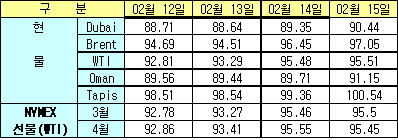 2월15일 1.09달러 올라 90.44달러 형성 … WTI 상승에 Brent는 하락 2월15일 Dubai유 현물가격이 전일 중동지역 정정불안 등의 요인이 뒤늦게 반영돼 90달러 중반으로 대폭 상승했다.국제유가는 장 초반 베네주엘라의 석유 공급 중단에 대한 우려 제기로 상승했으나 차익실현 매출 출회 및 미국 경제 둔화 전망 등으로 강보합으로 마감됐다. 한국석유공사에 따르면, 뉴욕상업거래소(NYMEX)에서 거래된 WTI(서부텍사스 중질유) 선물유가는 전일대비 0.04달러 상승한 95.50달러에, 런던석유거래소(ICE)의 Brent 선물유가는 0.53달러 하락한 94.63달러에 거래를 마감했다. Dubai유 현물가격은 전일대비 1.09달러 상승해 90.44달러를 형성했다.