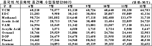 표, 그래프: | 중국의 석유화학 중간체 수입동향(2007) |