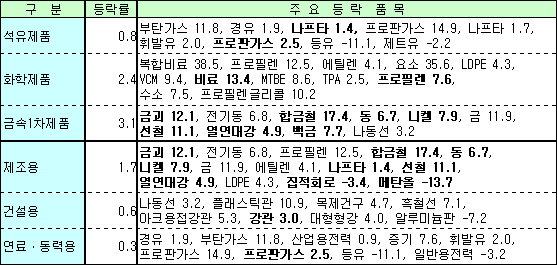 한국은행, 1월 가공물가 1.6% 상승 … 프로필렌 8%에 MTBE 9% 2008년 1월 화학제품 가공물가는 복합비료가 38.5% 폭등하는 등 전반적으로 오름세를 나타냈다.한국은행이 2월21일 발표한 <2008년 1월 가공단계별 물가동향>에 따르면, 원재료가 원유 및 곡물 등 국제 원자재 가격 상승세 지속으로 전월대비 3.8% 오름세를 보였고, 중간재도 석유ㆍ화학제품, 음식료품 및 담배를 중심으로 1.6% 상승했다. 또 자본재(0.5%)가 엔화대비 원화 약세의 영향으로, 소비재(0.2%)는 국제유가 상승 및 설 수요 증가의 영향으로 각각 오름세를 나타냈다. 원재료는 가뭄으로 인한 곡물작황 부진 및 바이오연료용 수요 증가 등으로 인해 수입곡물을 중심으로 농림수산품이 오르고, 국제유가 상승, 중국 및 중동지역 건설용 수요 증가세 지속으로 원유, 고철 등 수입 광ㆍ공산품도 크게 올라 전월대비 3.8%, 전년동월대비 45.1% 상승했다. 제조용은 토마토, 배추 등이 내렸으나 원유, 고철, 밀 등이 올라 3.9%, 연료용은 국제유가 및 석탄가격 상승세 지속으로 액화천연가스, 유연탄 등이 올라 2.7% 상승한 것으로 나타났다. 중간재는 곡물, 원유, 비철금속 등 국제원자재 가격상승, 주요 기업의 가동중단에 따른 공급차질 및 재고 감소의 영향으로 음식료품 및 담배, 석유ㆍ화학제품, 금속1차제품 등이 올라 1.6% 상승했다. 제조용은 폭설 등에 따른 중국의 비철금속 공급차질 및 달러 약세에 따른 투기적 수요 증가로 금괴, 전기동, 합금철 등이 올라 1.7% 상승했다.