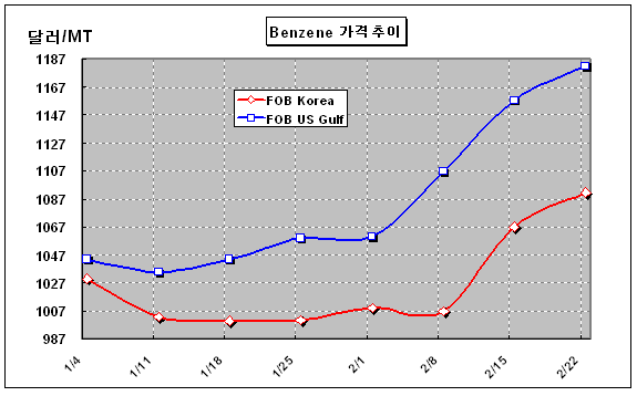 FOB Korea 1091-1092달러로 25달러 상승 … 미국가격은 1182달러 벤젠 가격은 2월 넷째 주 FOB Korea 톤당 1092달러로 25달러 상승했다.아시아 벤젠(Benzene) 시장은 국제유가의 강세와 미국 BTX의 강세가 맞물리면서 2주 연속 상승세를 나타내 1090달러를 넘어섰다. 국제유가는 2월 넷째 주 한때 WTI(서부텍사스 중질유) 기준 배럴당 100달러를 넘어섰고 이후에도 100달러에 가까운 강세를 지속하고 있고, 나프타(Naphtha)도 C&F Japan 톤당 900달러에 근접한 수준에서 움직이고 있다. 특히, 미국의 벤젠 가격은 FOB US Gulf 갤런당 394센트 수준으로 톤당 1182달러에 달해 전주에 비해 25달러 상승했다.