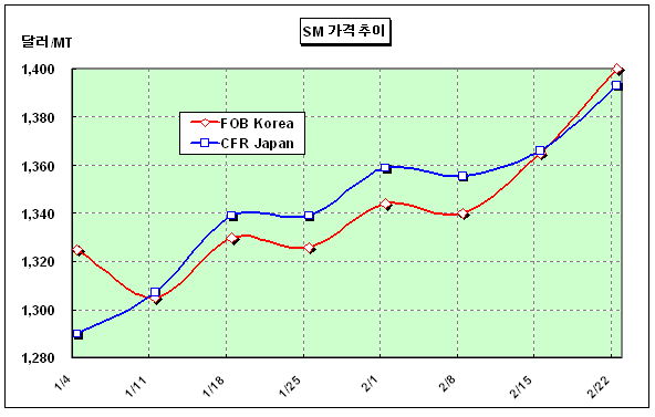 아시아 SM 가격은 최근 FOB 1390-1400달러 수준에서 움직이고 있는데, 유럽 및 미국 수출 여부에 따라 상승 또는 하락할 것으로 예상되고 있다. 중국의 SM 내수가격도 ex-tank Zhangjiagang/Jiangyin 톤당 1만1350위안으로 100위안 상승했다. 표, 그래프: | SM가격추이 | <화학저널 2008/2/27> |