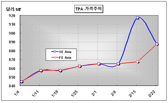한편, PTA의 2월 아시아 계약가격은 CFR Asia 톤당 890달러로 1월 870달러에 비해 20달러 올라 오랜만에 상승세를 나타냈다. 표, 그래프: | TPA가격추이 | <화학저널 2008/2/28> |