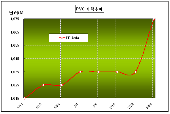 CFR FE Asia 1070-1080달러로 40달러 급등 … 중국 수급 타이트로 PVC 가격은 2월 다섯째 주 CFR FE Asia 톤당 1075달러로 40달러 상승했다.아시아 PVC(Polyvinyl Chloride) 시장은 수급이 타이트해지고 중국의 폭설 영향으로 물류까지 차질을 빚으면서 40달러 올라 25년 동안 최고가격을 기록했다. 이에 따라 일본의 PVC 생산기업들은 3월 공급가격으로 CFR China 1100달러를 요구했고 중국 바이어들이 수용한 것으로 알려졌다. 중국에서 춘절연휴 이후 폭설로 PVC 운송이 차질을 빚고 있기 때문이다.