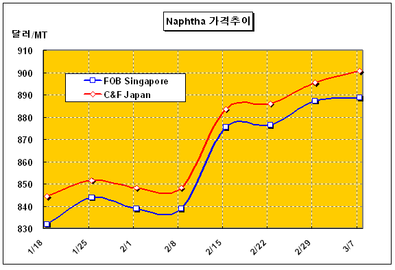 C&F Japan 900-902달러로 5달러 상승 … 유럽도 861달러로 상승 나프타 가격은 3월 첫째 주 C&F Japan 톤당 901달러로 5달러 상승했다.아시아 나프타(Naphtha) 시장은 국제유가가 배럴당 105달러를 넘어서는 초강세를 나타내고 타이완의 CPC가 구매에 적극 나섬에 따라 902달러까지 상승했다. 국제유가는 WTI(서부텍사스 중질유) 및 Brent유가 모두 105달러를 넘어서는 초강세를 보여 나프타 코스트를 압박하고 있다. 여기에 타이완 국영 CPC가 5월 하순 거래물량 15만톤을 구매하면서 MoPJ(Mean of Platts Japan)에 프리미엄을 톤당 1-2달러 추가 지급한 것으로 알려졌다.