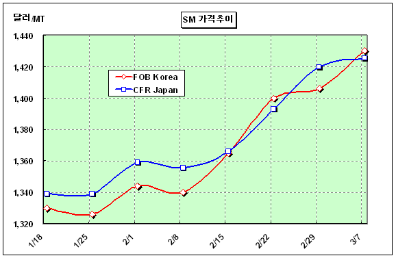 FOB Korea 1430-1431달러로 24달러 상승 … 수익 82-140달러 수준 SM 가격은 3월 첫째 주 FOB Korea 톤당 1430달러로 24달러 상승했다.아시아 SM(Styrene Monomer) 시장은 국제유가가 105달러를 돌파한 가운데 아시아의 크래커 가동률 감축이 잇따르면서 3주 연속 상승세를 기록했다. 반면, 중국가격은 90일 신용거래 기준 CFR China 톤당 1438달러로 5달러 하락했고, 내수가격은 1만1725위안을 형성했다.