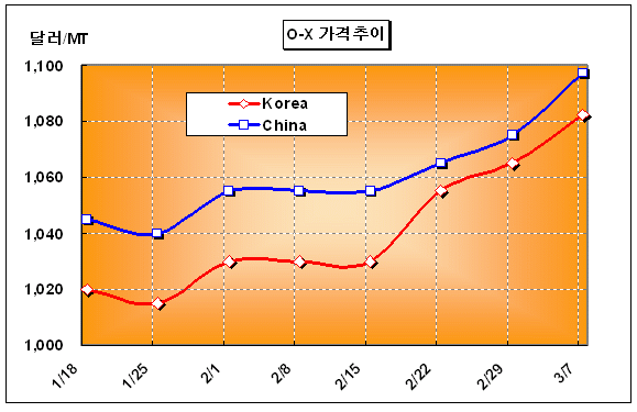 원료코스트 강세 영향으로 … 지역별 O-X Spot 공급 타이트 힘입어 아시아 O-X(Ortho-Xylene) 가격이 원료가격 상승과 지역별 수급타이트에 힘입어 3월7일 전주대비 20-25달러 상승해 CFR China 톤당 1095-1100달러, FOB Korea 톤당 1080-1085달러를 형성했다.원료 M-X(Mixed-Xylene) 가격은 전주대비 5-10달러 상승해 CFR Taiwan 톤당 985-990달러를 형성했다. 3월 하순 및 4월 초순 도착 예정인 O-X는 90일 신용거래 기준으로 CFR China 톤당 1105-1110달러에 체결됐는데 3월7일에는 거래가격이 20달러 상승한 것으로 나타났다. 시장 관계자는 “M-X와 O-X 스프레드의 손익분기점은 평균 120-150달러 수준으로 스프레드가 100달러 수준에 그침으로써 가동률이 저조하고 Spot 수급이 타이트해지고 있다”고 밝혔다.