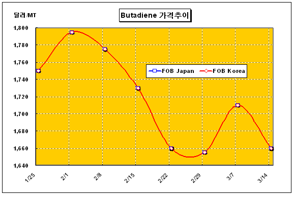 FOB Korea 1655-1665달러 형성 … 역외물량 유입에 중국 내부거래 부타디엔 가격은 3월 둘째 주 FOB Korea 톤당 1660달러로 50달러 하락했다.아시아 부타디엔(Butadiene) 시장은 역외지역의 공급물량이 유입된 상태에서 중국이 자체 거래로 Spot 구매에서 철수하면서 수요가 줄어들어 크게 하락했다. 중국에서는 Shen Hua가 Secco로부터 3월 하순 거래물량 1000톤을 CFR Nantong 톤당 1650달러에 구매한 것으로 알려졌다. 특히, 일본의 Mitsui, Mitsubishi, Sumitomo 등은 중국의 수요 약세 영향으로 Spot 거래에 나서지도 못했다.