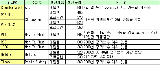 표, 그래프: | 동남아시아의 올레핀 가동현황 | <화학저널 2008/3/20> |