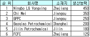 양사의 ABS 생산능력을 합하면 Ningbo LG화학의 45만톤을 웃돌아 중국 최대의 생산기업으로 도약하게 된다. 수입제품을 포함한 ABS 시장경쟁이 한층 치열해지는 가운데 생산능력 확대를 비롯한 사업기반 강화를 통해 경쟁력을 확보해갈 구상이다. 중국의 ABS 수요는 연평균 10%에 가까운 신장을 지속해 2007년 약 300만톤 수준으로 세계의 과반을 차지했다. 하지만, 중국은 생산기업 수 및 생산능력이 한정돼 있어 일본과 한국, 타이완 등으로부터 무려 200만톤 정도를 수입하고 있다. ABS는 자동차, 잡화 등 OA기기, 전기 등 용도가 광범위하며, 특히 수출용 제품이 수요를 견인해왔다. 다만, 확대되고 있는 자동차 생산 신장에 따라 앞으로 내수 신장도 기대되고 있다. 범용제품의 코스트 경쟁과 함께 자동차용으로 대표되는 특수 그레이드는 수입제품이 리더하고 있으며 경쟁이 한층 치열해지고 있다. 이에 따라 GPPC와 Chi Mei는 중국 Zhenjiang에서 사업통합에 따른 경쟁력을 강화할 방침이다. Chi Mei는 ABS 생산회사를 비롯해 PS(Polystyrene) 생산능력 35만톤 및 PMMA(Polymethyl Methacrylate) 생산거점을 보유하고 있다. Chi Mei 관계자는 “ABS 사업에 머무르지 않고 양사의 Zhenjiang 소재 3개 법인을 신회사로 일체화할 계획”이라고 밝혔다. GPPC 25만톤 플랜트, Chi Mei 35만톤 플랜트가 합병되면 총 생산능력이 60만톤에 달해 중국 최대의 ABS 생산기업으로 발돋움하게 된다. 합병 후 설비 등은 이설하지 않고 각각의 공장에서 생산을 지속할 방침인데, 원료 자급률이 낮아 중국의 ABS 생산기업 및 생산능력이 제한돼 있기 때문이다. 다만, 최근 SM(Styrene Monomer) 신증설이 활발해지는 등 원료사정이 변하고 있다. LG화학의 Ningbo 플랜트를 비롯해 생산능력 확대를 지향하는 메이저기 많아지고 신설계획도 추진되고 있어 경쟁력 확대와 성장시장 개척을 위한 ABS 투자가 본격적으로 추진하고 있다. 표, 그래프: | 중국의 ABS 생산능력 순위 | <화학저널 2008/3/24> |