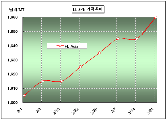 CFR FE Asia 1655-1665달러로 15달러 상승 … 중국은 수입 최소화 LLDPE 가격은 3월 셋째 주 CFR FE Asia 톤당 1660달러로 15달러 상승했다.LLDPE(Linear Low-Density Polyethylene) 시장은 사우디 플랜트의 트러블로 아시아 공급이 줄어들면서 재상승세를 보여 1660달러에 도달했다. 사우디에서는 PetroKemya의 LLDPE 플랜트가 예기치 않은 트러블을 가동을 중단한 것으로 알려졌다.