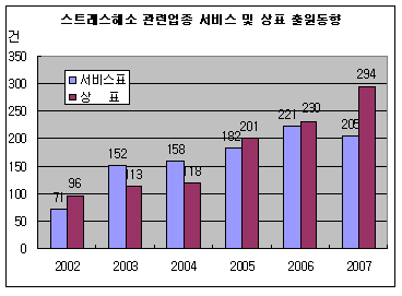 특허청, 스트레스 해소 관련 출원 꾸준히 증가 … 아로마테라피 55.6% 웰빙(Wellbeing) 바람을 타고 스트레스 해소 관련업종의 시장선점을 위한 개인 및 기업들의 상표출원이 꾸준히 증가하고 있는 것으로 나타났다.특허청에 따르면, 스파ㆍ요가ㆍ명상ㆍ아로마테라피 등 스트레스 해소 관련업종의 상표출원건수는 2002년 151건, 2003년 256건, 2004년 266건, 2005년 367건, 2006년 432건에 이어 2007년에는 459건으로 꾸준히 증가하고 있으며, 특히 스파(SPA) 분야는 2002년 30건에서 2007년 131건으로 5년만에 4배 이상 증가했다.