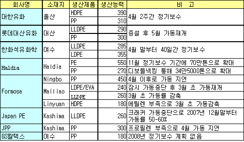 표, 그래프: | 아시아의 폴리올레핀 플랜트 가동현황 | <화학저널 2008/3/28> |