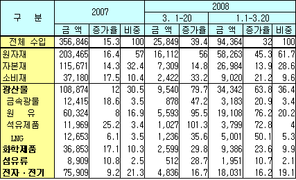 지경부, 3월 1-20일 29.8% 증가 25억9900만달러 … 원유는 42% 늘어 2008년 3월 화학제품 수입이 29.8% 증가한 25억9900만달러를 기록했다.지식경제부가 발표한 <2008년 3월 수출입동향>에 따르면, 2008년 3월 수입은 전년동월대비 25.9% 증가한 368억7000만달러로 원자재와 소비재를 중심으로 증가세 기록했다. 조업일수를 고려한 하루평균 수입액은 전년동월대비 28.6% 증가한 16억달러로 증가세를 지속했다.