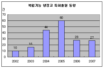 특허청에 따르면, 2002-07년 복합기능 냉장고 특허 출원건수는 185건으로 연평균 31건의 특허출원이 꾸준히 계속되고 있는 것으로 나타났다. 건강관리기능을 구비한 냉장고가 26건(14%), 사용자인식기능을 구비한 냉장고가 20건(11%), 멀티미디어 냉장고가 55건(29%), 공기조화기능을 구비한 냉장고가 42건(23%), 무선식별기능을 구비한 냉장고가 42건(23%)을 차지했다. 특허청 관계자는 “냉장고의 신규수요를 창출하기 위해 앞으로 더욱 다양한 기능을 구비한 냉장고가 지속적으로 개발될 것”이라고 기대했다. <김 은 기자> 표, 그래프: | 복합기능 냉장고 특허출원 동향 | <화학저널 2008/4/2> |