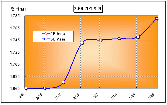 CFE China 1780달러로 30달러 상승 … 한국은 1820달러 판매 2-EH(Ethylhexanol)는 재고 감소로 DOP(Dioctyl Phthalate) 생산기업들이 적극적으로 구매에 나서면서 4월 입찰가격이 90일 신용거래 기준 CFR China 톤당 1750-1760달러까지 상승했다.동북아시아 무역업자들은 중국 수요기업들의 적극적인 구매의사로 입찰가격을 20-30달러 높은 CFR China 톤당 1780달러까지 상승 조정한 것으로 알려졌다. 중국의 DOP 내수가격은 2-EH 가격상승에도 불구하고 보합세를 유지했지만, 2-EH 생산기업들은 일본의 타이트한 Spot 물량에 힘입어 2-EH 4월 가격이 90일 신용거래 기준 CFR China 톤당 1800달러 안착을 목표로 하고 있는 것으로 전해졌다.