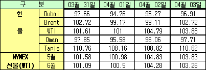 4월3일 1.64달러 올라 96.91달러 형성 … WTIㆍBrent는 급락 4월3일 Dubai유 현물가격은 96달러 후반으로 상승했다.반면, Dubai유를 제외한 국제유가는 미국 경기 침체 우려에 따른 석유 수요 감소 전망으로 하락했다. 한국석유공사에 따르면, 뉴욕상업거래소(NYMEX)에서 거래된 WTI(서부텍사스 중질유) 선물유가는 전일대비 1.00달러 하락한 103.83달러에, 런던석유거래소(ICE)의 Brent 선물유가는 1.23달러 하락한 102.52달러에 거래를 마감했다. Dubai유 현물가격은 전일대비 1.64달러 상승해 96.91달러를 형성했다.