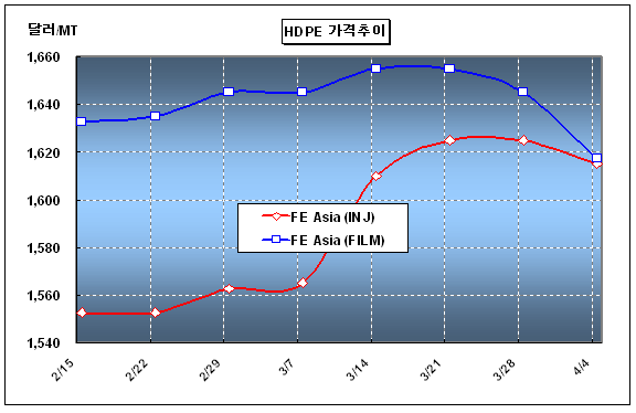 CFR FE Asia 1610-1620달러로 10달러 떨어져 … 약세 본격화 HDPE 가격은 4월 첫째 주 CFR FE Asia 톤당 1615달러로 10달러 하락했다.HDPE(High-Density Polyethylene) 시장은 무역상들이 약세를 예상해 재고를 방출하면서 장기간의 강세를 접고 약세로 전환됐다. 국내 석유화학기업들은 아직까지 Film 그레이드 HDPE에 대해 CFR China 톤당 1630달러를 요구하고 있으나 일부에서는 1600달러에도 공급할 의사를 나타낸 것으로 알려졌다.
