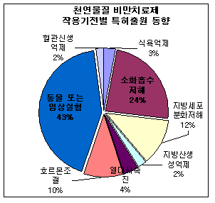또 외국에서 개발돼 시판되고 있는 비만치료제의 대부분은 화학적으로 제조된 의약품인 반면, 한국에서는 천연물을 이용해 비만치료제를 개발하려는 연구가 활발히 진행되고 있는 것으로 알려졌다. 특허청에 따르면, 1998-2007년 천연물 비만치료제 관련 특허출원은 총 178건으로 2000년 5건에서 2007년에는 31건으로 크게 증가했고 총 출원건수의 90%가 내국인에 의한 출원이며 50%가 제약기업 및 벤처기업에 의한 출원되고 있다. 2002년 이후 출원이 급증한 것은 비만치료에 대한 사회적 관심 증가와 더불어 정부의 천연물 R&D 지원정책 및 천연물 관련 바이오벤처기업이 증가했기 때문으로 분석된다. 식물 추출물에 관한 출원이 전체 출원의 92%로서 광물(2%) 및 동물, 미생물 추출물(6%)에 비해 압도적으로 많았고, 1종 천연 추출물에 대한 출원(69%)이 2종 이상의 복합 천연 추출물에 관한 출원(31%)보다 많았으며, 각 출원에 기재된 천연물 소재가 대부분 상이해 다양한 천연물 소재로부터 비만치료제를 개발하려는 연구가 진행되고 있는 것으로 해석된다. 또 지방 등의 소화흡수 저해제(24%), 지방세포분화 저해제(12%), 호르몬 조절제(10%), 열대사 촉진제(4%), 식욕 억제제(3%), 지방산 생성 억제제(2%), 혈관신생 억제제(2%) 등 생명공학기술의 발전을 통해 규명되고 있는 다양한 비만 발생 기전을 활용해 새로운 비만치료제를 개발하려는 연구가 활발히 진행되는 있는 것으로 나타났다. 표, 그래프: | 천연물질 비만치료제 작용기전별 특허출원 동향 | <화학저널 2008/4/8> |