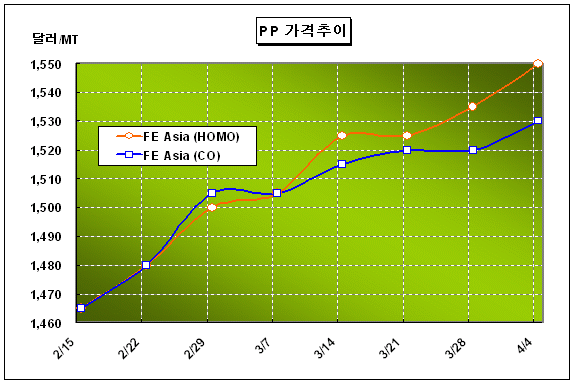 CFR FE Asia 1545-1555달러로 15달러 올라 … Formosa 45만톤 가동 PP 가격은 4월 첫째 주 CFR FE Asia 톤당 1550달러로 15달러 상승했다.아시아 PP(Polypropylene) 시장은 수급이 타이트한 상태에서 원료가격까지 상승해 2주 연속 15달러 수준의 상승세를 나타냈다. 이에 따라 Raffia/Injection 그레이드는 CFR China 톤당 1550달러, CFR SE Asia 1560-1570달러를 형성했고, IPP Film 그레이드는 CFR China 1555-2560달러, CFR SE Asia 1580-1590달러에도 거래된 것으로 알려졌다. 중국 내수가격은 Raffia/Injection 그레이드 기준 ex-works 톤당 1만2100-1만2200위안을 형성했다.