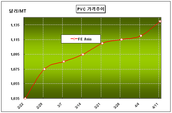 CFR FE Asia 1135-1145달러 형성 … 중국 카바이드 생산 감축으로 PVC 가격은 4월 둘째 주 CFR FE Asia 톤당 1135-1145달러로 20달러 상승했다.아시아 PVC(Polyvinyl Chloride) 시장은 중국의 카바이드 베이스 내수가격이 연속 상승한데 힘입어 1100달러 중반까지 오름으로써 기염을 토했다. 중국의 카바이드(Carbide) 베이스 PVC 내수가격은 4월 첫째 주에 톤당 300위안 상승한데 이어 둘째 주에도 350위안(50달러) 추가 상승해 8600위안을 형성했고, 에틸렌(Ethylene) 베이스 PVC 내수가격도 8850위안을 나타냈다. 중국 정부가 베이징(Beijing) 올림픽에 대비해 환경오염을 줄이기 위해 카바이드 생산을 줄이도록 하고 있기 때문이다.