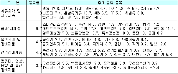 환율상승 영향과 원유를 비롯한 국제원자재 가격의 상승세가 지속되면서 금속1차제품과 석유화학제품이 오르고 일반기계 및 장비제품 등이 올랐기 때문이다.