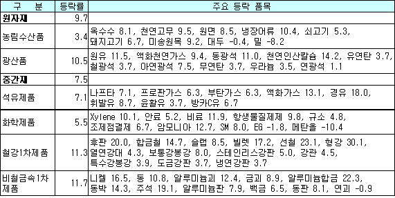 철강1차제품은 철광석, 고철 등 원자재의 가격이 오르면서 후판, 합금철, 슬랩, 빌렛 등 관련 철강제품도 큰 폭 상승해 11.3%, 비철금속1차제품은 니켈, 동, 알루미늄괴 등 비철금속소재가 오르고 알루미늄합금, 동판 등 관련 비철금속압연품도 올라 무려 11.7% 상승했다. <김 은 기자> 표, 그래프: | 원자재 및 중간재 수입물가 변화(2008.3) | <화학저널 2008/4/16> |