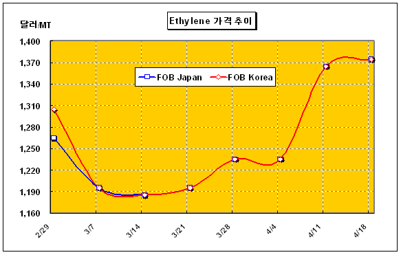 FOB Korea 1375달러로 10달러 상승 … 이란 4500톤 공급영향 주목 에틸렌 가격은 4월 셋째 주 FOB Korea 톤당 1370-1380달러로 10달러 상승했다.아시아 에틸렌(Ethylene) 시장은 나프타 크래커의 가동률 감축이 계속되면서 수급타이트가 지속돼 1400달러 돌파가 우려되고 있다. 실제 일부 석유화학기업들은 5월 공급물량 가격으로 FOB Korea 톤당 1390-1410달러를 요구하고 있는 것으로 알려졌다.