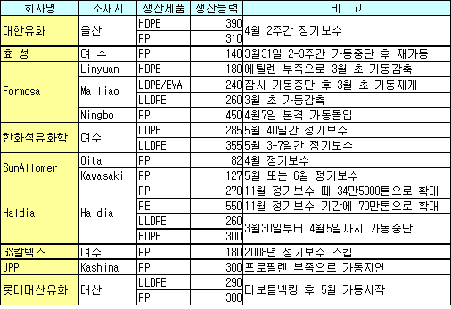 롯데대산유화는 디보틀넥킹 후 5월 가동 … 대한유화는 4월 보수 완료 한화석유화학이 여수 소재 LDPE(Low-Density Polyethylene)와 LLDPE(Linear Low-Density PE) 플랜트의 정기보수를 각각 5월 한달간, 3-7일간 실시할 계획이며 정기보수기간 동안 LDPE No.2 12만톤 플랜트의 생산능력을 4만2000톤 확대할 계획이다.롯데대산유화는 디보틀넥킹을 완료하고 5월 LLDPE 29만톤과 PP(Polypropylene) 30만톤을 본격 가동할 계획이다. 대한유화는 울산 소재 HDPE(High-Density PE) 39만톤과 PP 31만톤 정기보수를 4월 2주간 실시한 것으로 알려졌다.
