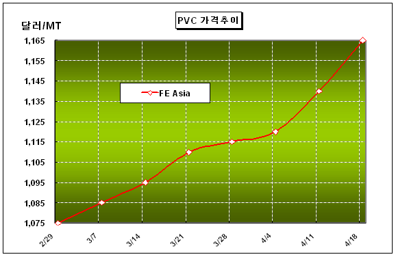 CFR FE Asia 1160-1170달러로 25달러 올라 … 카바이드 생산 제한 PVC 가격은 4월 셋째 주 CFR FE Asia 톤당 1165달러로 25달러 상승했다.아시아 PVC(Polyvinyl Chloride) 가격은 중국의 환경규제로 카바이드 생산이 줄어들고 아시아 Spot 공급도 제한되면서 1160달러를 넘어섰다. 중국 정부는 베이징(Beijing) 올림픽을 앞두고 카바이드(Carbide) 생산을 줄이도록 요구하고 있어 카바이드 베이스 PVC 공급이 제한되고 있다.