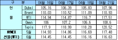 4월21일 2.13달러 올라 107.96달러 형성 … WTIㆍBrent도 상승 4월21일 Dubai유 현물가격이 107달러 후반으로 크게 상승했다.Dubai유를 제외한 국제유가는 나이지리아 파이프라인 테러로 인한 공급차질, 스코틀랜드 정제시설 공급차질, 일본 유조선 피격 소식 등으로 상승했다. 한국석유공사에 따르면, 뉴욕상업거래소(NYMEX)에서 거래된 WTI(서부텍사스 중질유) 선물유가는 전일대비 0.79달러 상승한 117.48달러에, 런던석유거래소(ICE)의 Brent 선물유가는 0.51달러 상승한 114.43달러에 거래를 마감했다. Dubai유 현물가격은 전일대비 2.13달러 상승해 107.96달러를 형성했다.