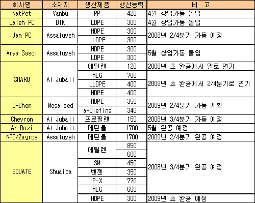 표, 그래프: | 중동의 석유화학 프로젝트(2008) | <화학저널 2008/4/25> |