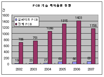특허청, 2007년 특허출원 80건으로 4배 급증 … 3.5세대 이동통신용 필수 전자제품에 대한 초고속화, 초소형화, 다기능화 등의 요구가 확대되면서 전자회로를 구성하는 저항(R), 커패시터(C), 인덕터(L) 등 수동소자와 집적회로(IC) 등을 인쇄회로기판(PCB: Printed Circuit Board)에 내장시키는 임베디드 PCB(Embedded PCB) 기술이 주목되고 있다.휴대폰의 단말기 크기를 줄이는 작업이 계속 진행되면서 카메라, MP3, 터치스크린 등 다양한 기능이 부가됨에 따라 보통의 표면 실장형 PCB로는 기술적 한계에 달하고 있기 때문이다. 이에 따라 관련업계에서는 3세대 이동통신용 휴대전화에서는 보통의 표면 실장형 PCB 기술로도 지원하는 데 큰 문제가 없지만, 3.5세대 이동통신용 이후부터는 임베디드 PCB 기술이 필수적일 것으로 전망하고 있다. 특허청에 따르면, PCB 관련 특허출원은 매년 증가하다가 2006년 1403건에서 2007년에는 다소 주춤한 반면, 임베디드 PCB 기술에 대한 출원은 2002년 19건에서 2007년 80건으로 4배 이상 급증한 것으로 나타났다.