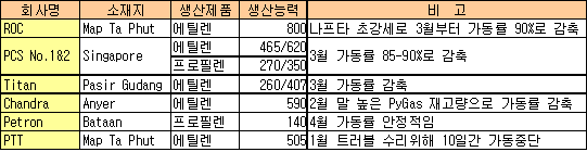 나프타 초강세로 에틸렌 수익성 악화 심화 … PyGas 재고도 높아 동남아 올레핀(Olefins) 생산기업들이 국제유가 고공행진 장기화에 따른 나프타(Naphtha) 초강세로 수익악화에 대응해 가동률을 감축하고 있다.ROC는 3월부터 Map Ta Phut 소재 에틸렌(Ethylene) 80만톤의 가동률을 90%로 감축했다. PCS도 3월부터 Singpore 소재 No.1 에틸렌 46만5000톤과 프로필렌(Propylene) 27만톤, No.2 에틸렌 62만톤과 프로필렌 35만톤의 가동률을 85-90% 수준을 유지하고 있다. Titan은 3월 들어 Pasir Gudang 소재 에틸렌 26만톤과 40만7000톤의 가동률을 감축했지만 정확한 감축규모는 밝혀지지 않고 있다. Chandra는 2월 말 PyGas의 높은 재고량으로 Anyer 소재 에틸렌 59만톤의 가동률을 감축한 것으로 알려졌다.
