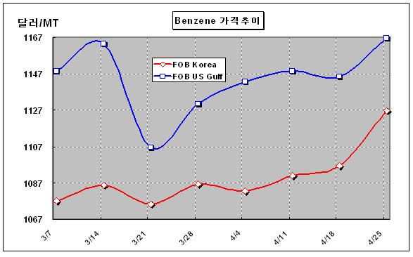 FOB Korea 1127달러로 30달러 상승 … Kashima BTX 플랜트 화재로 벤젠 가격은 4월 넷째 주 FOB Korea 톤당 1127달러로 30달러 상승했다.아시아 벤젠(Benzene) 시장은 일본의 BTX 플랜트 가동차질에 따라 1000달러를 돌파해 11개월만에 최고수준을 기록했다. 일본 Kashima Aromatics의 BTX 플랜트에서 화재가 발생해 가동을 중단했기 때문으로 벤젠 생산능력이 19만톤으로 나타나고 있다.