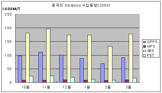 3월 HIPS 9만869톤으로 41.7% 급증 … PET는 73.0% 폭증 중국의 Styrenics 수입이 2008년 들어 1월과 2월 뚜렷한 감소세를 나타낸 반면 3월에는 모두 증가세로 전환돼 들쭉날쭉한 행보를 나타내고 있다.GPPS(General-Purpose Polystyrene) 수입은 2007년 10월 9만7177톤으로 14.1% 감소한 후 11월 11만1732톤으로 14.9% 증가했지만 12월 10만122톤으로 10.3%, 1월 8만8116톤으로 11.9%, 2월 6만9586톤으로 21.0% 감소했지만 3월 9만1381톤으로 31.3% 증가했다. HIPS(High-Impact PS)도 10월 8725톤으로 9.5%, 11월 8586톤으로 1.5% 감소한 후 12월 9585톤으로 11.6% 증가했지만 1월 8935톤으로 6.7%, 2월 6964톤으로 22.0% 감소했고 3월에는 9869톤으로 41.7% 폭증했다. ABS(Acrylonitrile Butadiene Styrene)도 10월 18만1620톤으로 9.0% 감소했고 11월 19만6469톤으로 8.1% 증가했지만 12월 17만3696톤으로 11.5% 감소했고 1월 17만3677톤으로 0.1%, 2월 13만2563톤으로 23.6% 급감했지만 3월에는 17만8196톤이 수입돼 34.4% 증가했다.