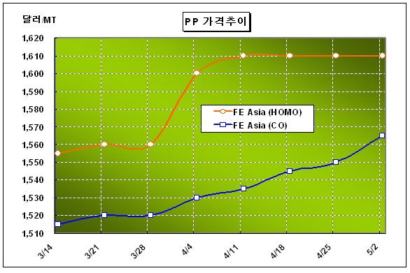 CFR FE Asia 1575달러로 10달러 상승 … Formosa 45만톤 풀가동으로 PP 가격은 5월 첫째 주 CFR FE Asia 톤당 1575달러로 10달러 올랐다.아시아 PP(Polypropylene) 시장은 원료 프로필렌(Propylene) 공급부족으로 생산 차질이 빚어지면서 상승세를 지속해 1600달러에 근접했다. Oman Polypropylene이 프로필렌 공급부족으로 4월 초부터 Sohar 소재 PP 34만톤 플랜트의 가동을 중단한 것이 결정적으로 영향을 미쳤다. Oman PP는 5월 말까지 PP 플랜트의 가동을 중단할 것으로 알려졌다.