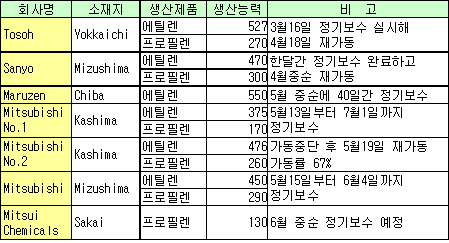 TosohㆍSanyo는 가동 재개 … MitsubishiㆍMaruzen은 정기보수 돌입 일본의 주요 올레핀(Olefin) 크래커 재가동이 줄줄이 이어지고 있어 수급에 영향을 끼칠 것으로 보이지만 동시에 정기보수도 맞물려 상쇄될 것으로 예상된다.Tosoh는 Yokkaichi 소재 에틸렌(Ethylene) 52만7000톤과 프로필렌(Propylene) 27만톤 플랜트를 3월26일부터 정기보수를 실시해 4월18일 재가동에 돌입했다. Sanyo는 Mizushima 소재 에틸렌 47만톤과 프로필렌 30만톤을 한달간 정기보수 완료하고 4월 중순 가동을 재개했다.