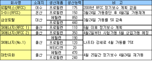 GS칼텍스와 S-Oil 등은 RFCC를 통한 프로필렌 정기보수를 2008년에는 계획하고 있지 않은 것으로 알려졌다. <이선애 기자> 표, 그래프: | 국내의 올레핀 플랜트 가동현황(2008) | <화학저널 2008/5/9> |