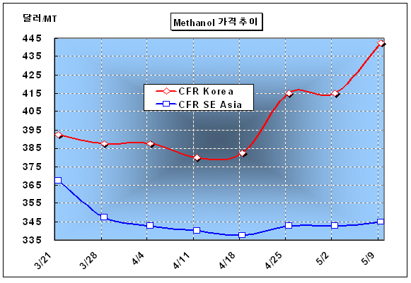 CFR Korea 440-445달러로 28달러 상승 … 동남아는 340-350달러 메탄올 가격은 5월 둘째 주 CFR Korea 톤당 440-445달러로 27.5달러 상승했다.아시아 메탄올(Methanol) 가격은 중국 수요가 증가함에 따라 수급이 타이트한 동북아는 상승한 반면 동남아는 정체돼 가격 차이가 톤당 100달러에 달했다. 동북아는 CFR Korea 톤당 440-445달러로 상승한 반면, 동남아는 CFR SE Asia 톤당 340-350달러에 불과했기 때문이다. 중국은 휘발유 블렌딩용 DME(Dimethyl Ether) 생산이 증가하면서 메탄올 가격이 톤당 225위안 상승해 약 3850위안에 달함으로써 수입가격 기준 440달러를 형성한 것으로 알려졌다.