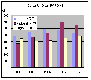 특허청에 따르면, 2003-07년 출원된 상표 중 <Green>이 포함된 상표가 2737건으로 가장 많았고, 다음으로 Natural이 2730건, High가 2217건, Pro가 2030건, Bio가 1542건 순으로 선호했다.